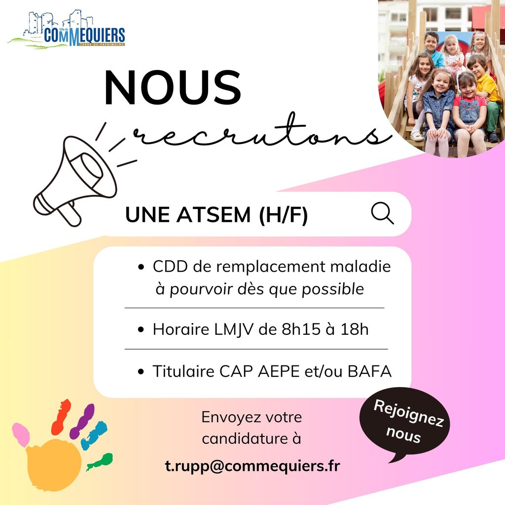 La Mairie de Commequiers recherche en urgence une ATSEM pour remplacer un agent actuellement en arrĂȘt maladie.